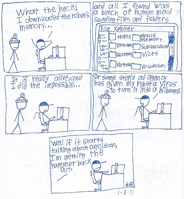 Time was short this week so I was rushed to get the comics done. This one was drawn in the good old fashioned lined notebook, and outlined in black ink becuase I didn't have my blue pen. I enjoy the simplicity of this one. There is nothing better than a guy with a plunger on his face.